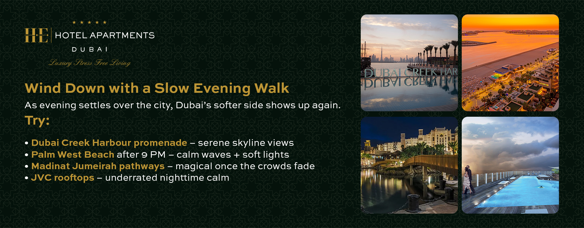 As evening settles over the city, Dubai’s softer side shows up again. Try: